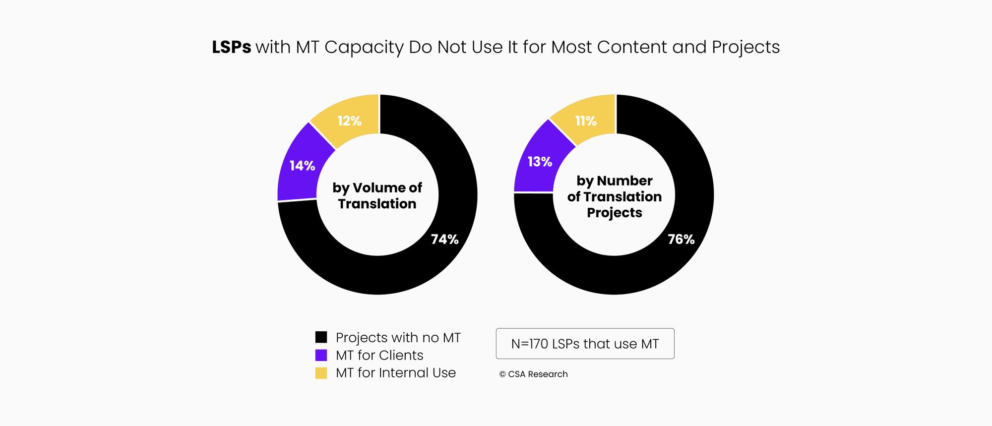 The CSA survey polled a cross-section of 170 LSPs (from their "Ranked 191" set of largest global LSPs) on their MT use and MT-related challenges. The quality of the sample is high and thus these findings are compelling.