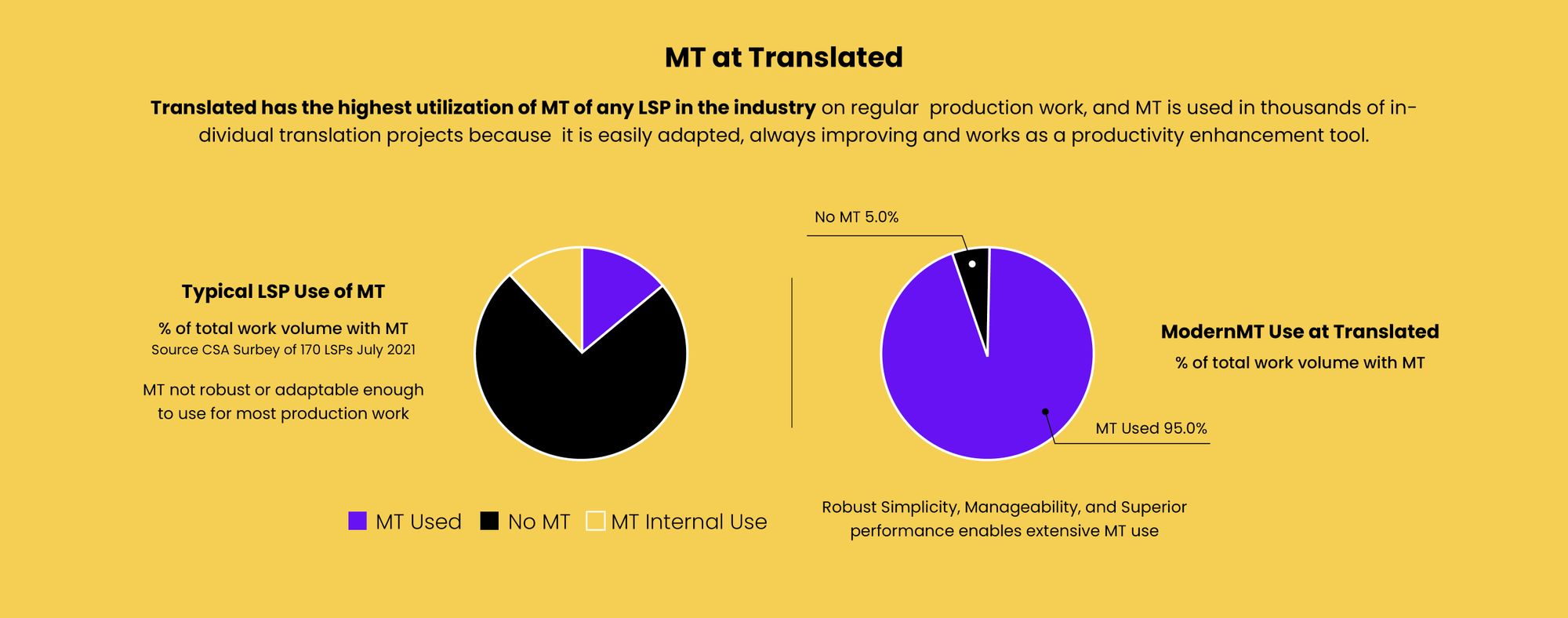 This apparent market reality validated by this representative sample is in stark contrast to what happens at Translated Srl, where 95% of all projects and all client work use MT (ModernMT) since it is a proven way to expedite and accelerate translation productivity.