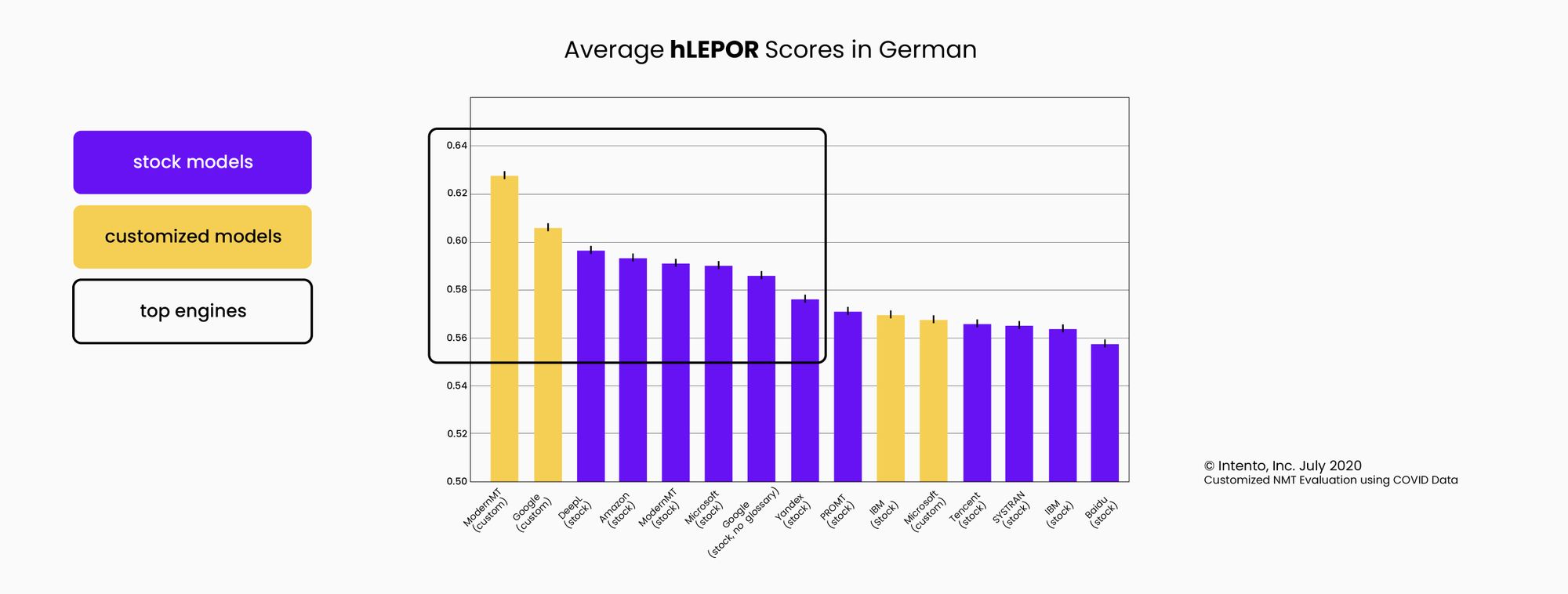 Independent evaluations confirm ModernMT quality improves faster with COVID data set on English > German. ModernMT was also the "top performer" on several other languages tested.
