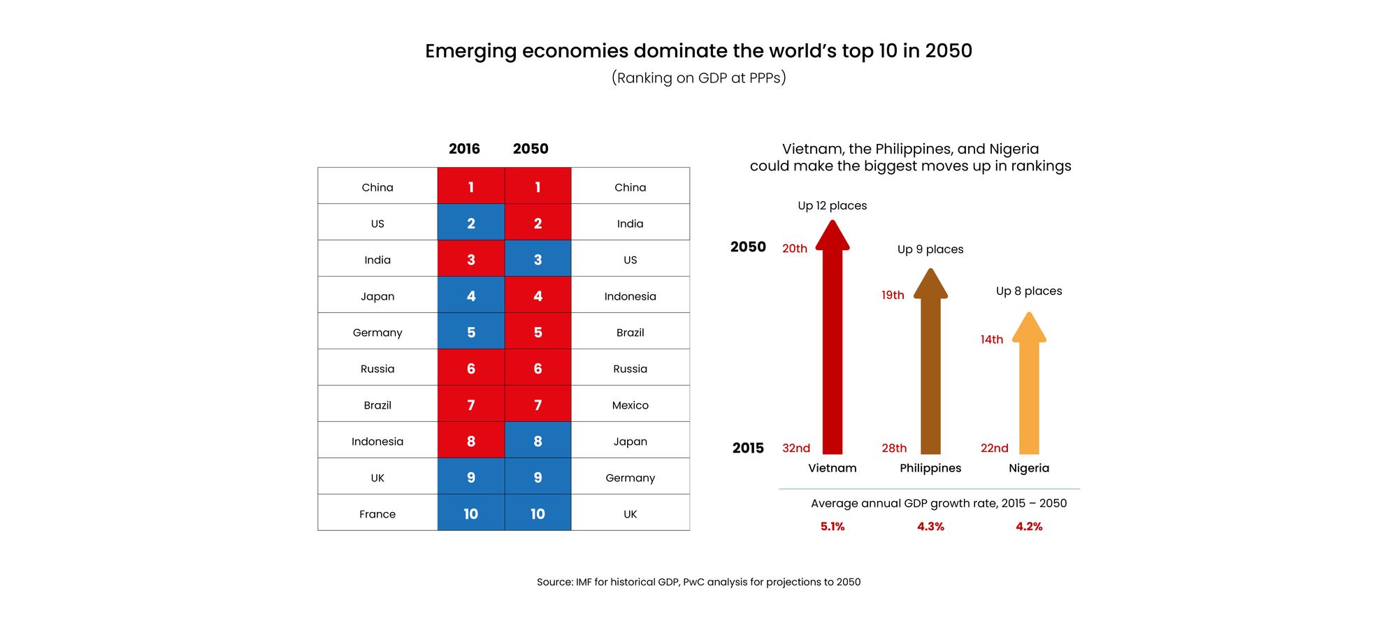 - The top 15 fastest-growing economies over the next 30 years will all be developing and emerging market economies according to PwC projections