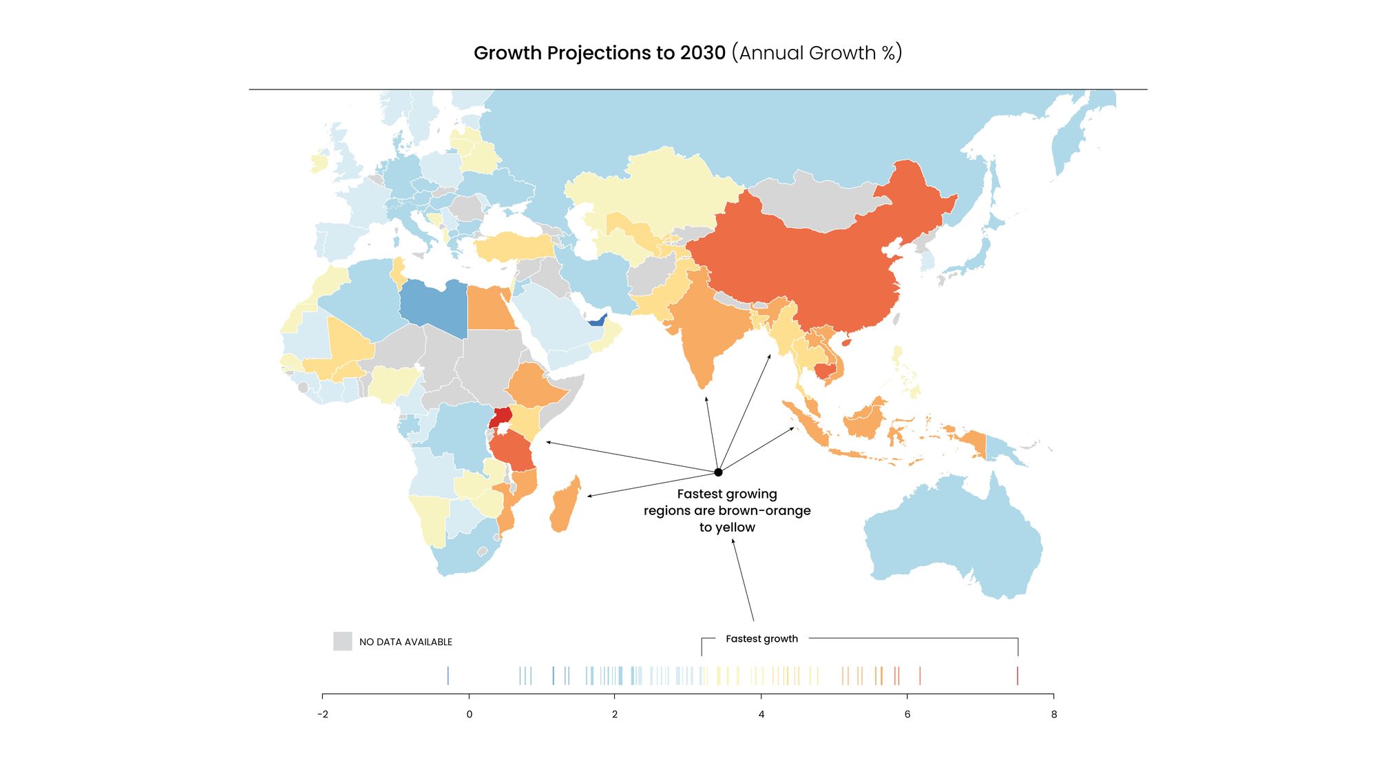 China, Vietnam, Uganda, Indonesia, and India are projected to be among the fastest-growing economies by 2030 according to the Harvard Growth Lab projections. Their research also factors in the ability of the country to develop complex production capabilities and finds that countries that have diversified their production into more complex sectors, like Vietnam and China, are those who will experience the fastest growth in the coming decade.