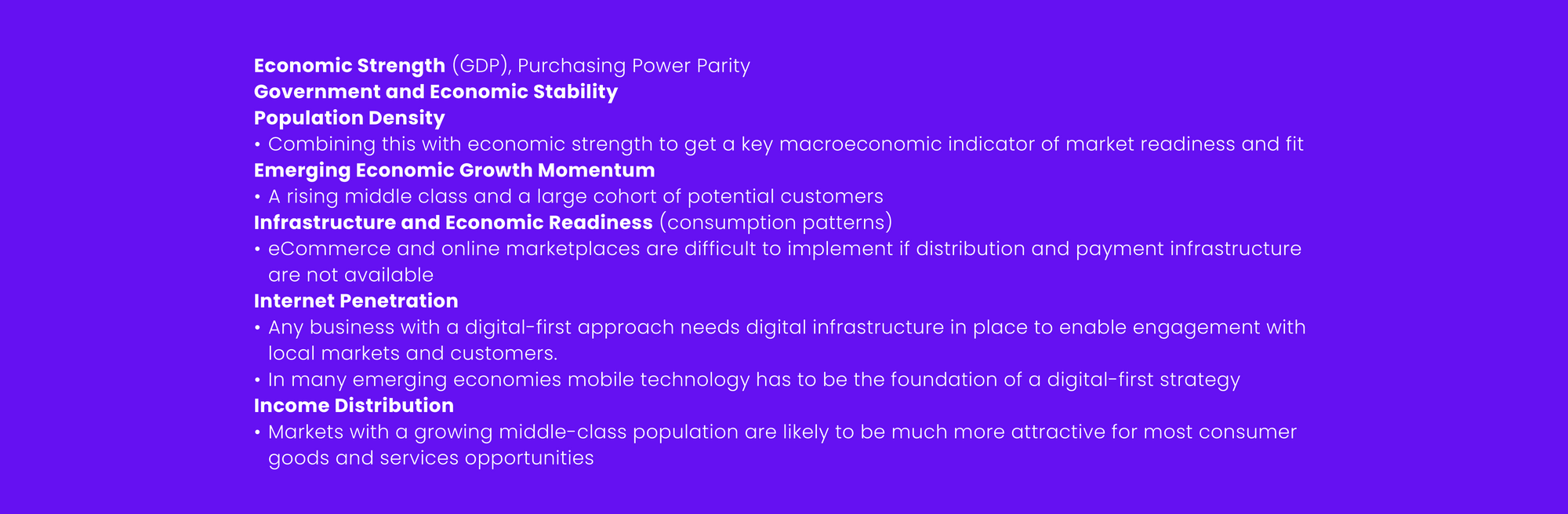 This growth momentum data correlates with macroeconomic business potential, but a global business needs to determine a market opportunity match by including several other factors beyond the possibility that there is a large and growing potential customer base. Apart from product fit and basic organizational infrastructure issues needed to serve global customers across the world, several other macroeconomic factors also need to be considered. These include all of the following: