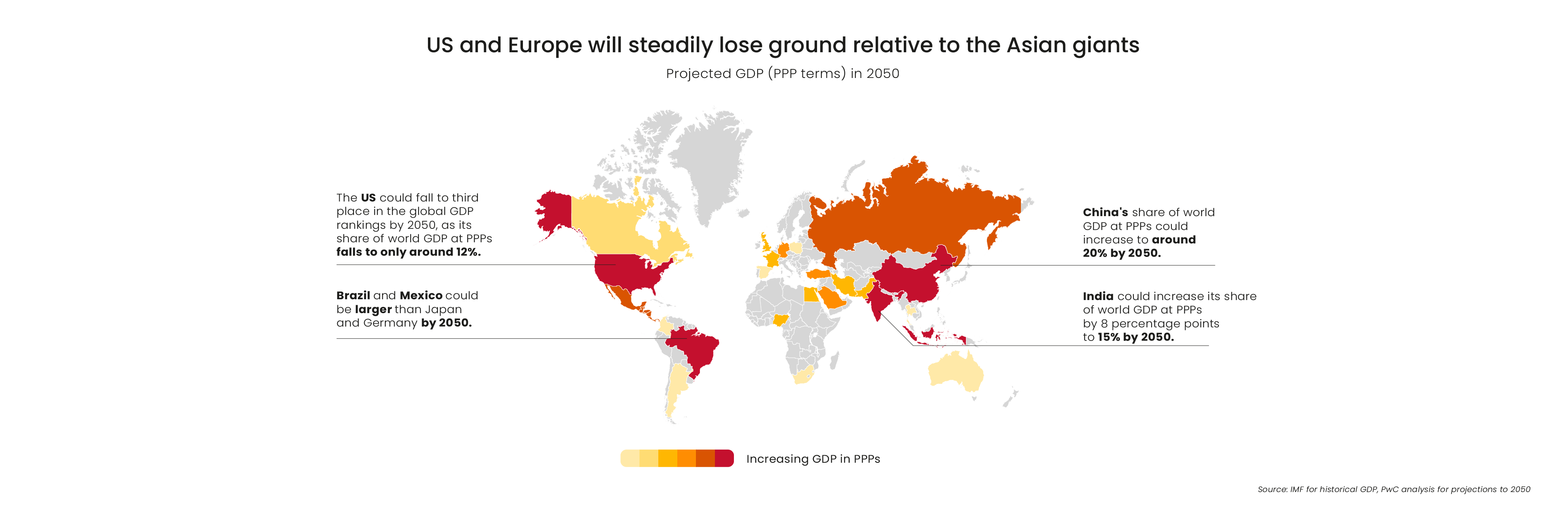 - Europe’s share of the world economy at PPPs could fall from around 15% to 9% by 2050