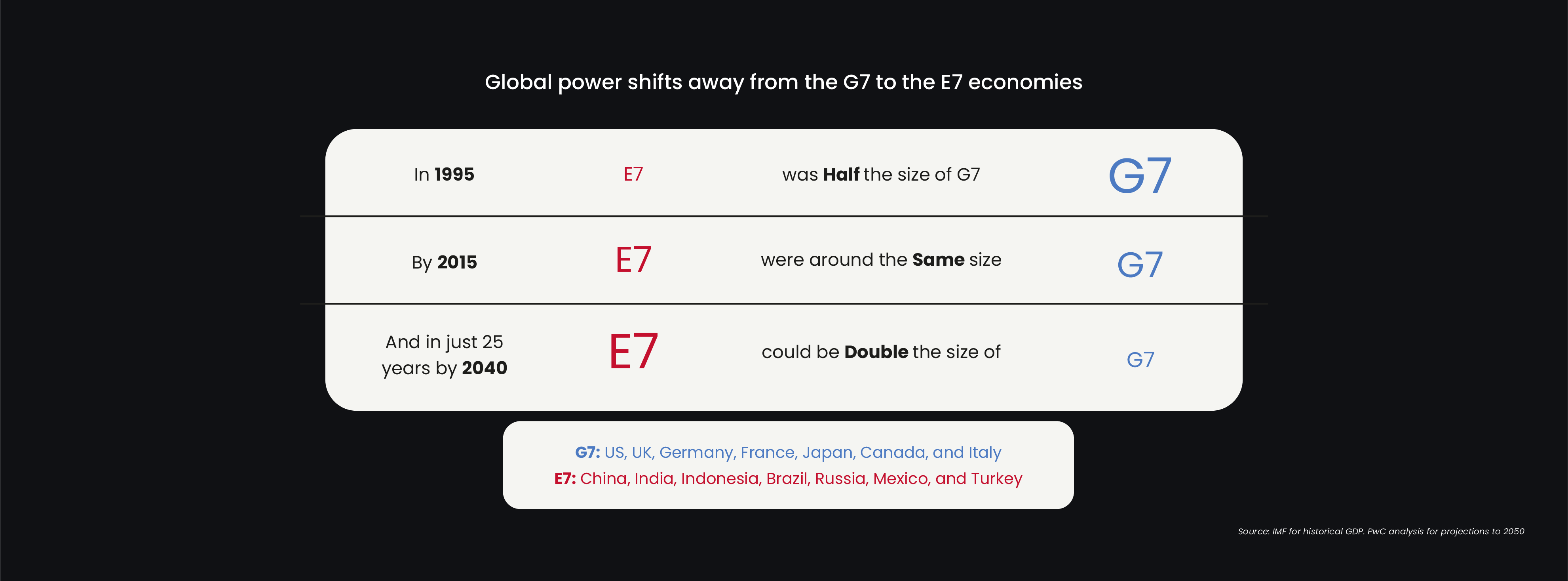 This comparison between the G7 and E7 economies done by Pricewaterhouse Coopers (PwC) for “The World in 2050” study, provides a capsule view of these trends. PwC estimates six of the seven largest economies in the world are projected to be emerging economies in 2050 led by China (1st), India (2nd), and Indonesia (4th).