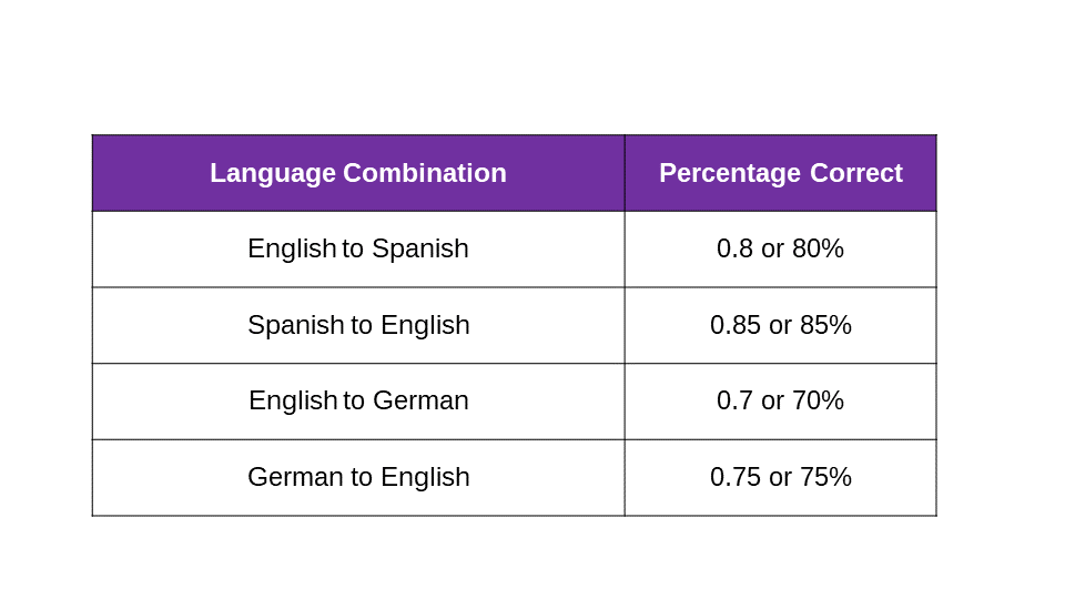Thus, if we do a formal evaluation of the output of various MT systems (each language direction should be considered a separate system) and find that the following table is true for our samples by running 5,000 sentences through various MT conversions (translations) and scoring each MT translation (conversion) as a percentage “correct” in terms of linguistic accuracy and precision.