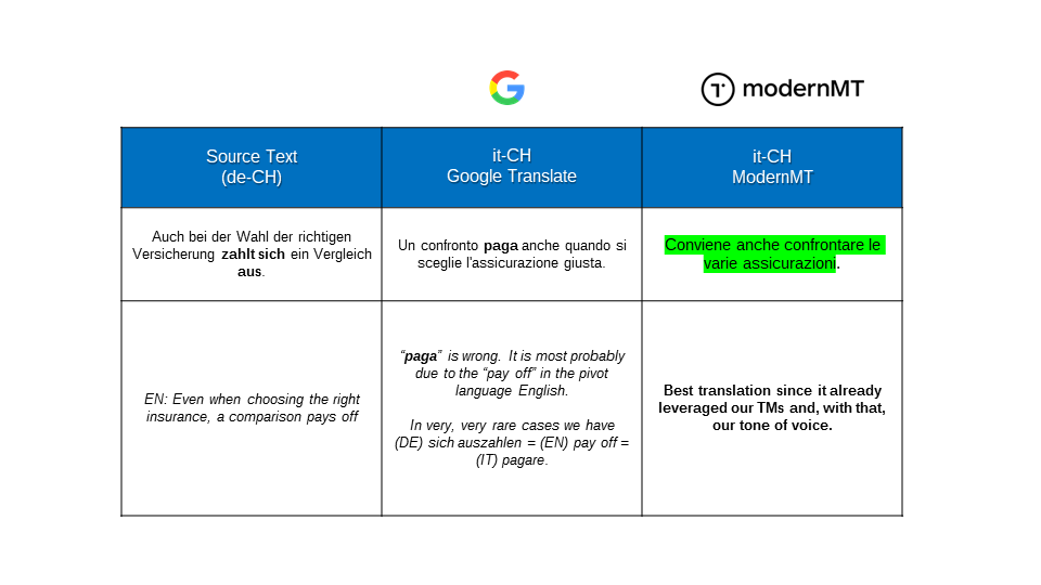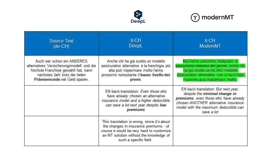 We were even able to solve our peculiar issue with the tone of voice for Swiss Italian: which is neither formal nor informal. Just impersonal - so instead of writing “you should compare insurances” we have “it is important to compare insurances”. It took just a couple of weeks to have it function in our MT output as we wanted.
