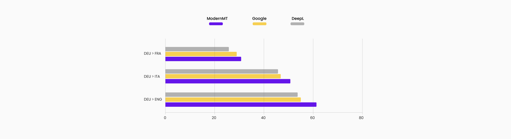 We evaluated different MT solutions using ModelFront: the first candidates were Google Translate, DeepL, and ModernMT. For the latter, we just used one year (2020) of Translation Memory as a training data set for customization. ModernMT proved to be the best solution, even with this minimal customization: