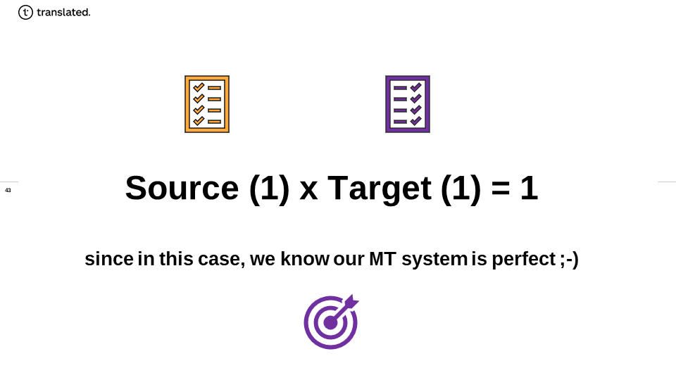 This point seems to evade many who advocate this method of evaluation, so let us clarify with some mathematics as math is one of the few conceptual frameworks available to man where the proof has meaningful certainty. If one has a “perfect MT system” then the Source and Target segments should be very close to each other if not the same. The perfect score would be 1, which would mean that all the information in the source would be present in the target. Thus, anything less than perfect would be less than 1. So mathematically we could state this as: