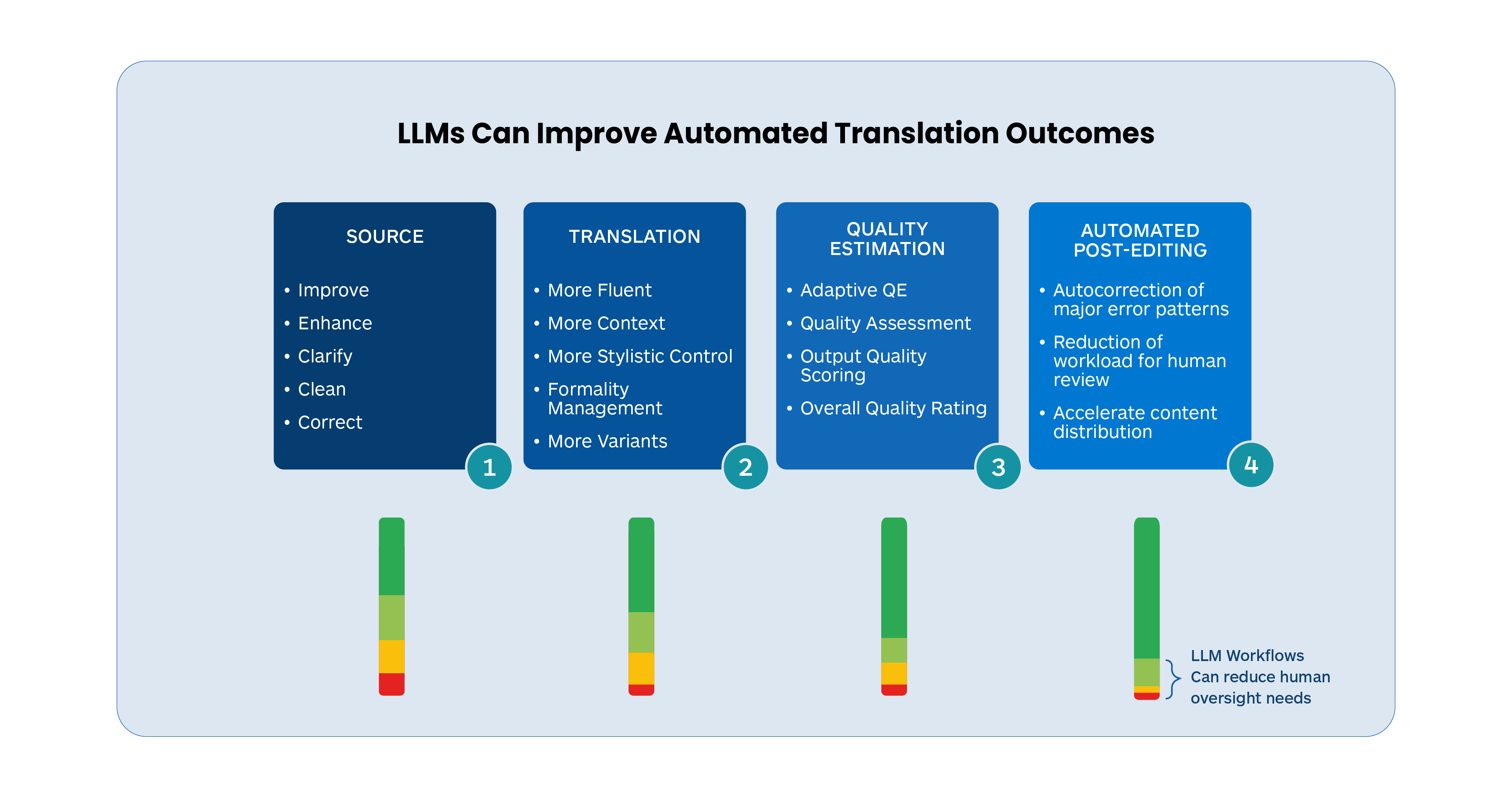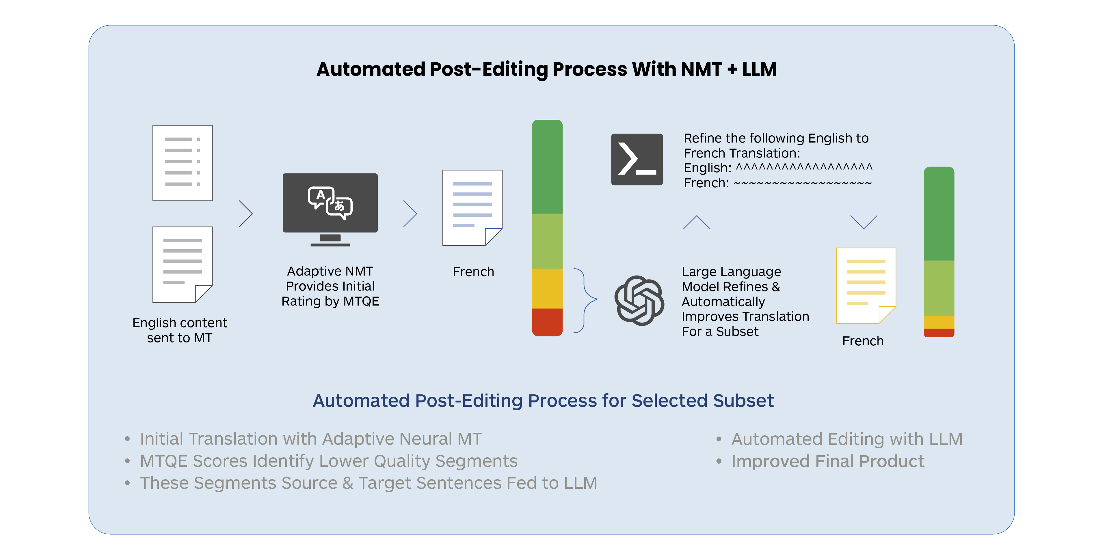 However, as LLMs get faster and it is easier to automate sequences of tasks, it may be possible to embed both an initial quality assessment and an automated post-editing step together for an LLM-based process to manage.