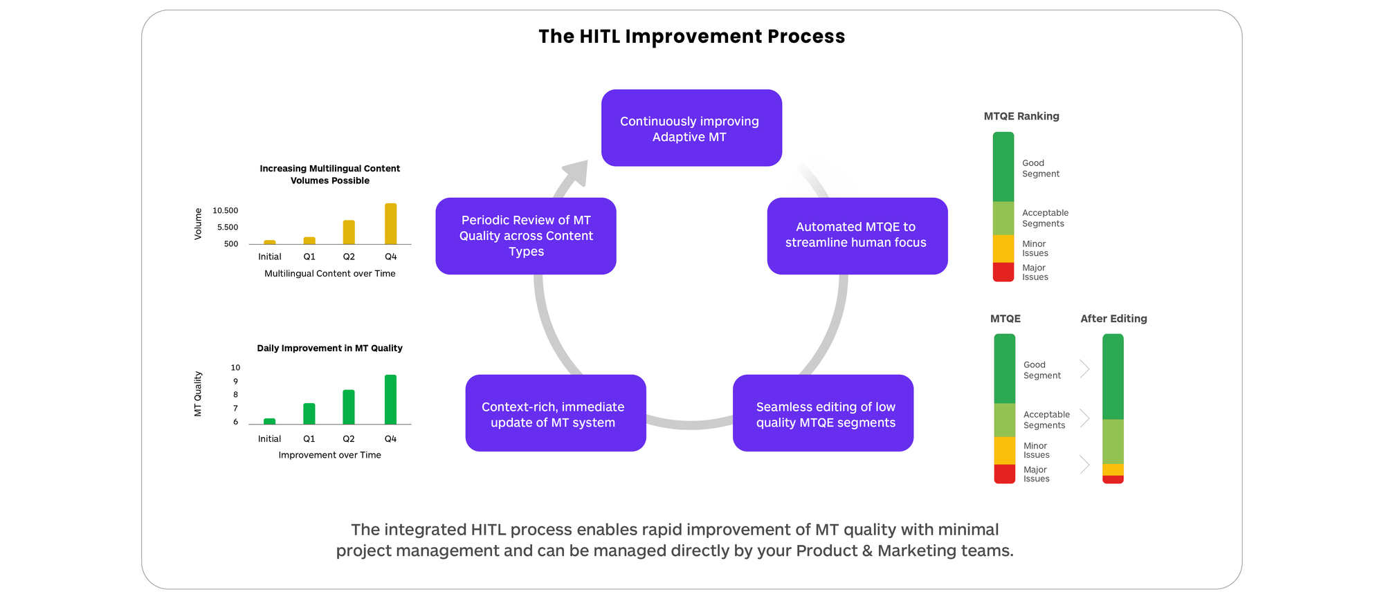 When a responsive adaptive MT system is integrated with a robust MTQE system and a tightly connected human feedback loop, enterprises can significantly increase the volume of published multilingual content.