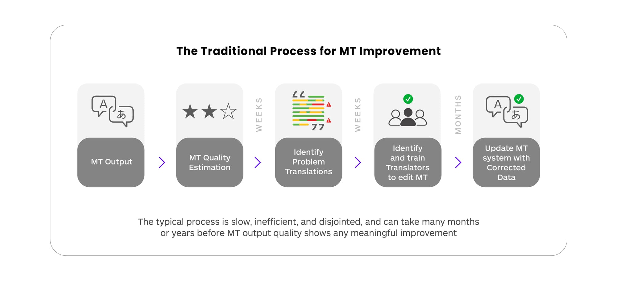 The conventional method, involving various vendors with distinct processes, is typically slow and prone to errors. However, this sluggish and inefficient method is frequently employed to enhance the quality of MT output, as shown below.