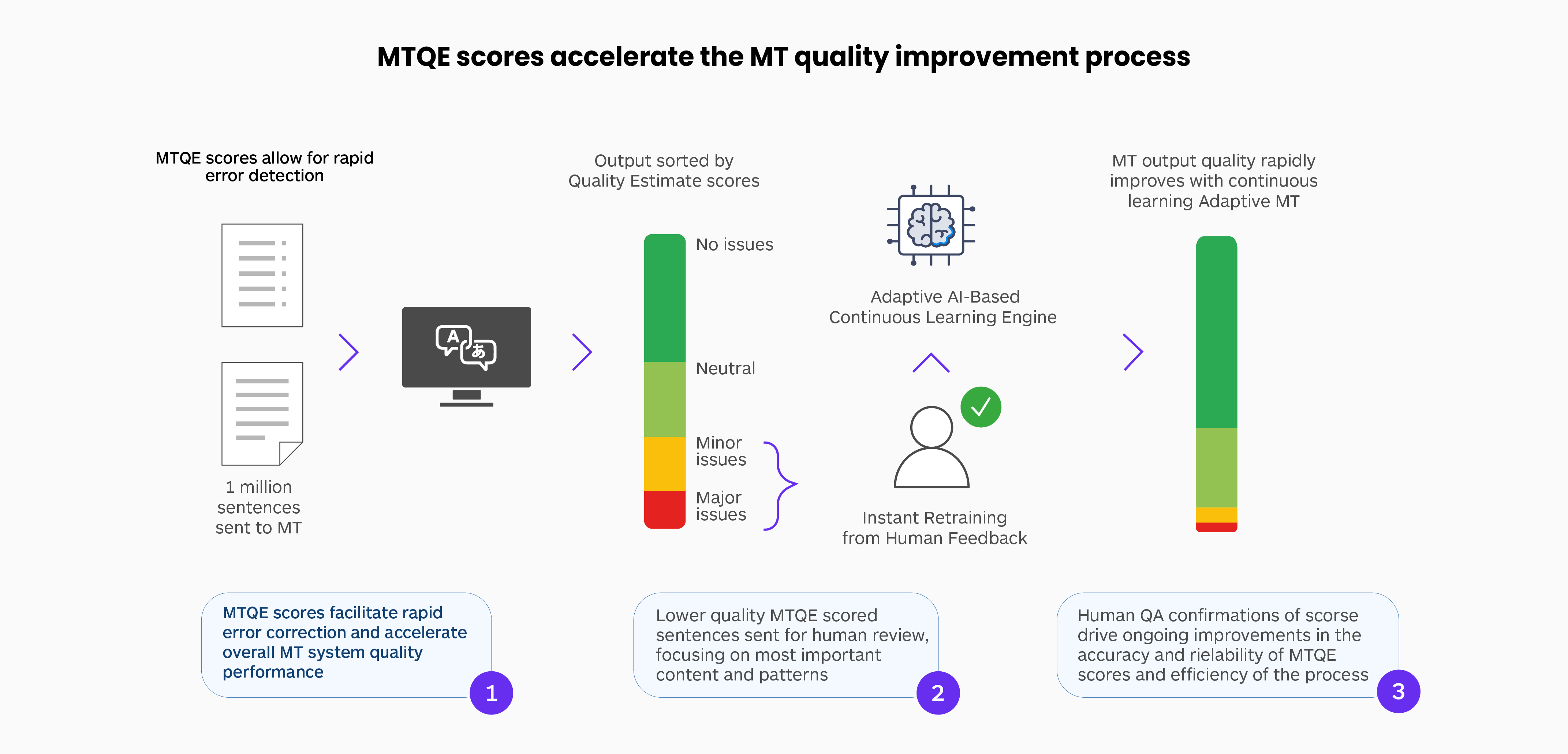 As MT content volumes rapidly increase in the enterprise, it becomes more important to make the quality management process more efficient, as human review methods do not scale easily. It is useful for any multilingual-at-scale initiative to rapidly identify the MT output that most need correction and focus critical corrective feedback primarily on these lower-quality outputs to enable the MT system to continually improve and ensure overall improved quality on a large content volume.