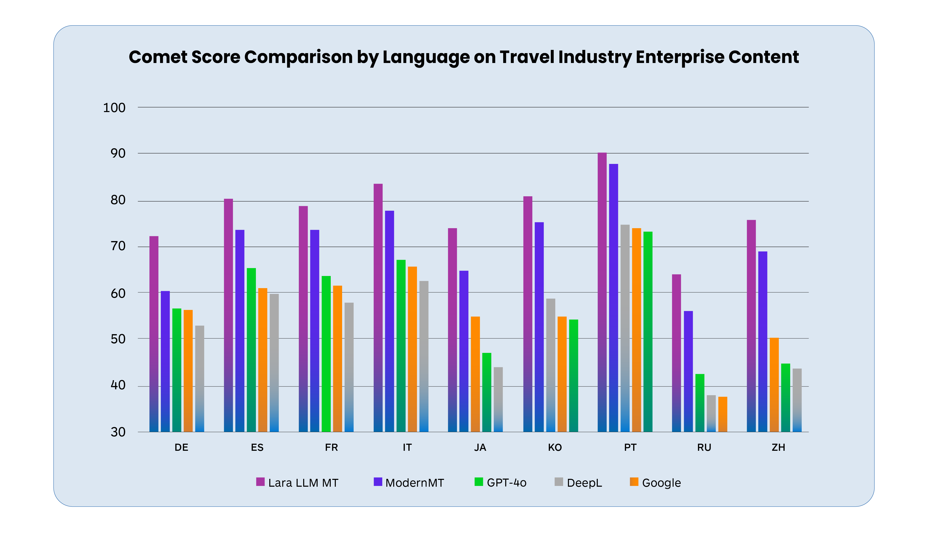 The chart below shows evidence of our progress with LLMs. MT quality performance is compared across several languages and the chart compares the relative output quality performance of the following systems Google (static), DeepL (static), Translated LLM MT (Lara RAG), GPT-4o (5-shot), and also a ModernMT adapted system.