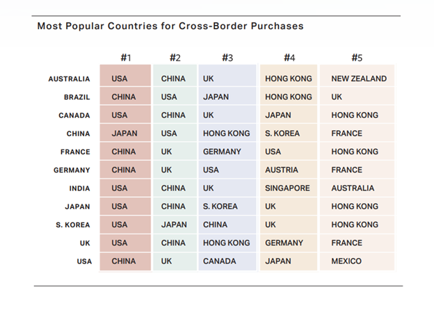The USA, China, and the UK consistently ranked among the top 3 countries purchased from in most markets. Japan and Korea are markets where the translation is even more critical to success, as cultural reluctance to cross-border purchases is significantly higher.