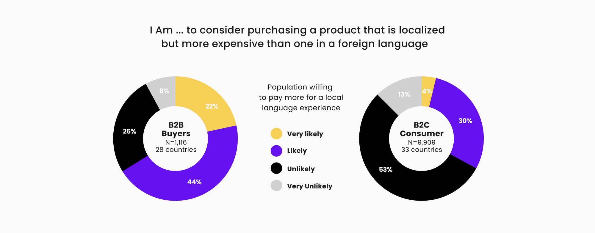 Research from CSA states that there is “a strong preference for local language and localization, even if it costs the buyer more. Nearly two-thirds (66%) of business users told us they’d pay up to 30% more for a localized product (2020 survey), and just a bit more than one-third (34%) of consumers said they would also be willing to dig deeper into their wallets for products adapted to their language and market.”