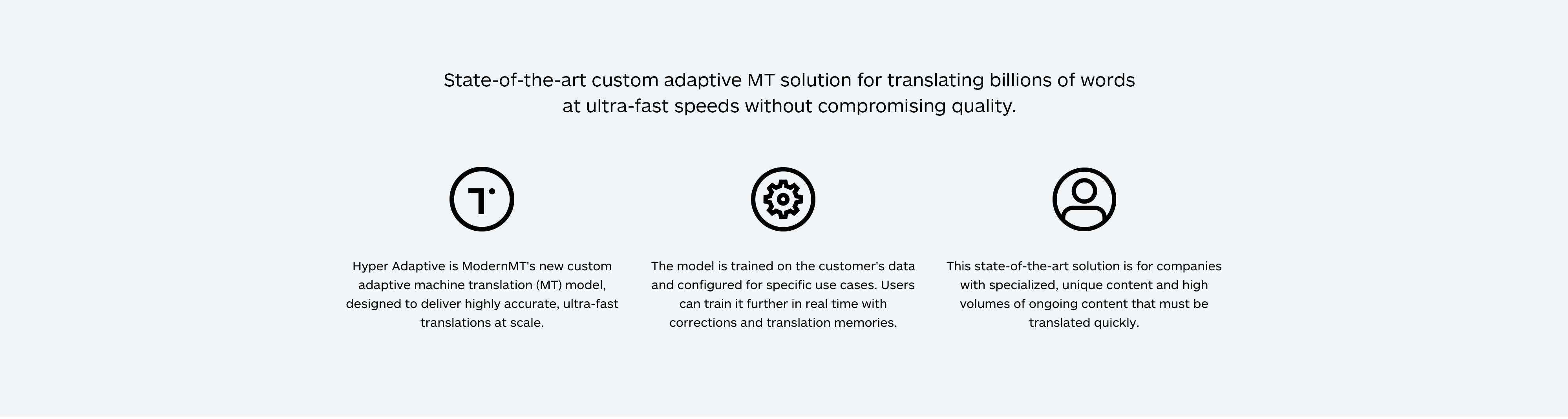 Hyper Adaptive solves this issue by using sophisticated compression techniques and training the MT model for specific use cases based on the customer's previous translations and translation memories (TMs) to ensure high-quality performance even at a scale of many billions of words a month.