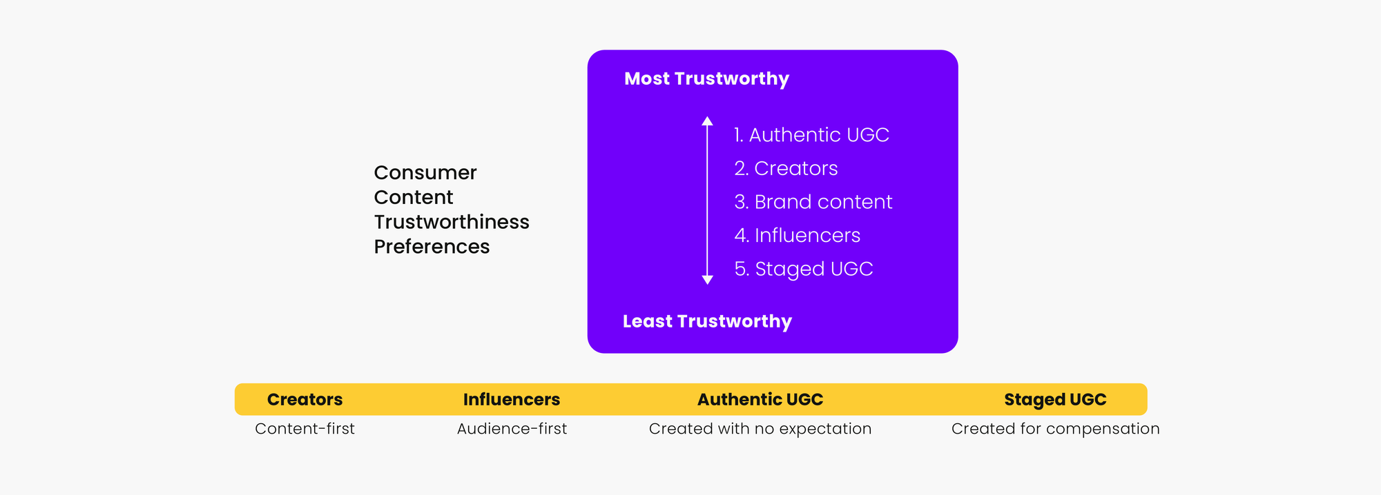 Furthermore, UGC provides valuable insights into customers' experiences and perspectives and enables the enterprise to engage with customers more deeply and effectively. Statistics show that consumers find UGC 9.8x more impactful than influencer content, and 79% of people say UGC highly impacts their purchasing decisions. Some of the most recent research also confirms that consumers rank authentic UGC as the most trustworthy content in their buyer journey.