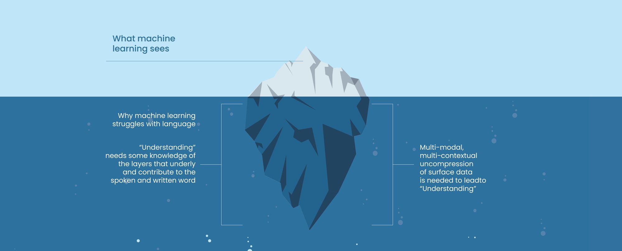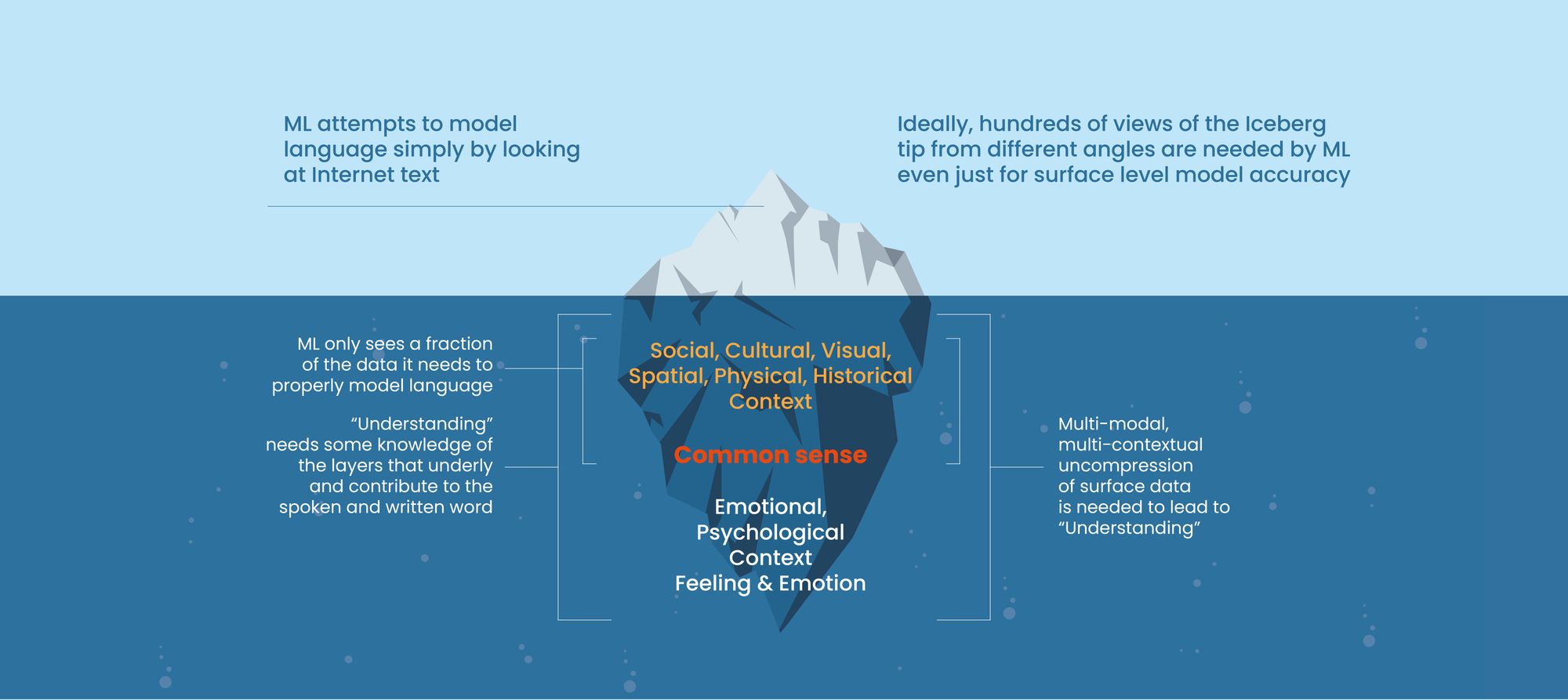 The key issue is that ML systems are fed words (the tip of the iceberg), and these words don’t contain the necessary pragmatic information of common knowledge. Humans can express more than words convey because we share a reality. But AI algorithms don’t. AI is faced with the impossible task of imagining the shape and contours of the whole iceberg given only a few 2D pictures of the tip of the iceberg.