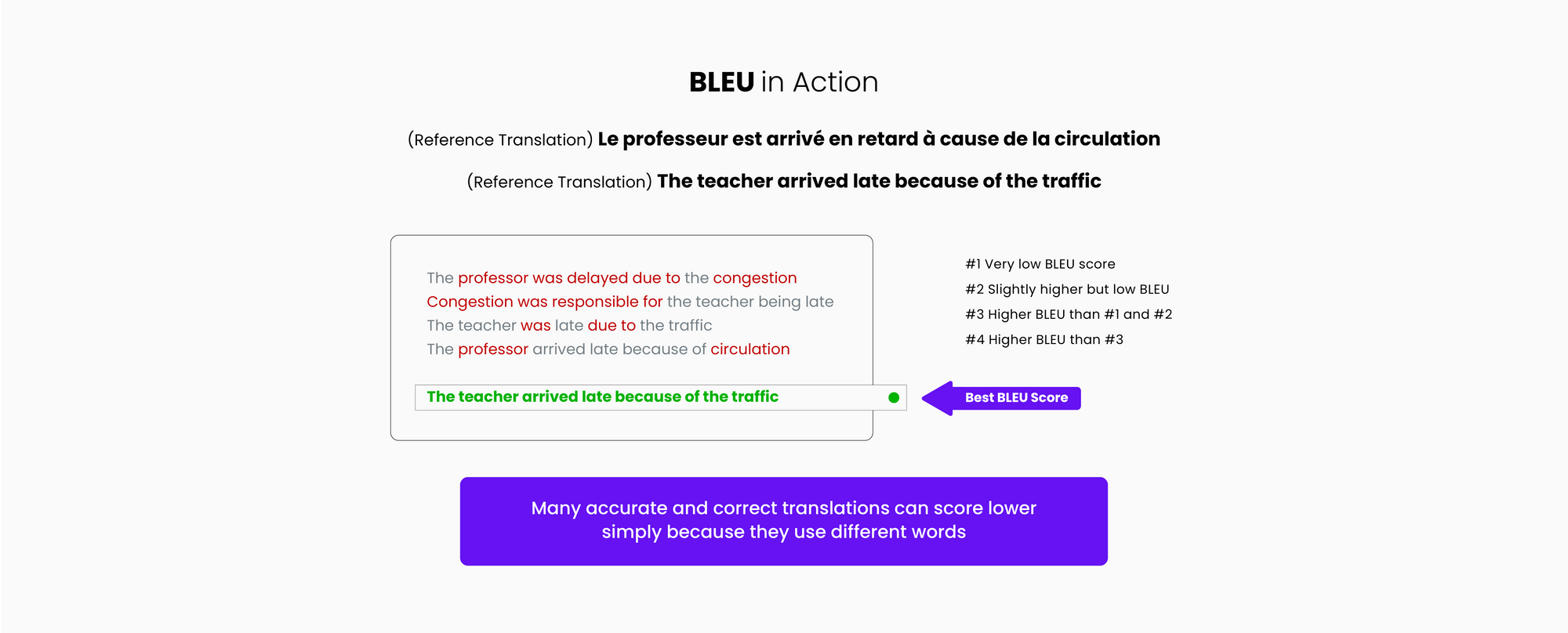 There are several criticisms of BLEU that should also be understood if you are to use the metric effectively. BLEU only measures direct word-by-word similarity and looks to match and measure the extent to which word clusters in two sentences or documents are identical. Accurate translations that use different words may score poorly since there is no match in the human reference.