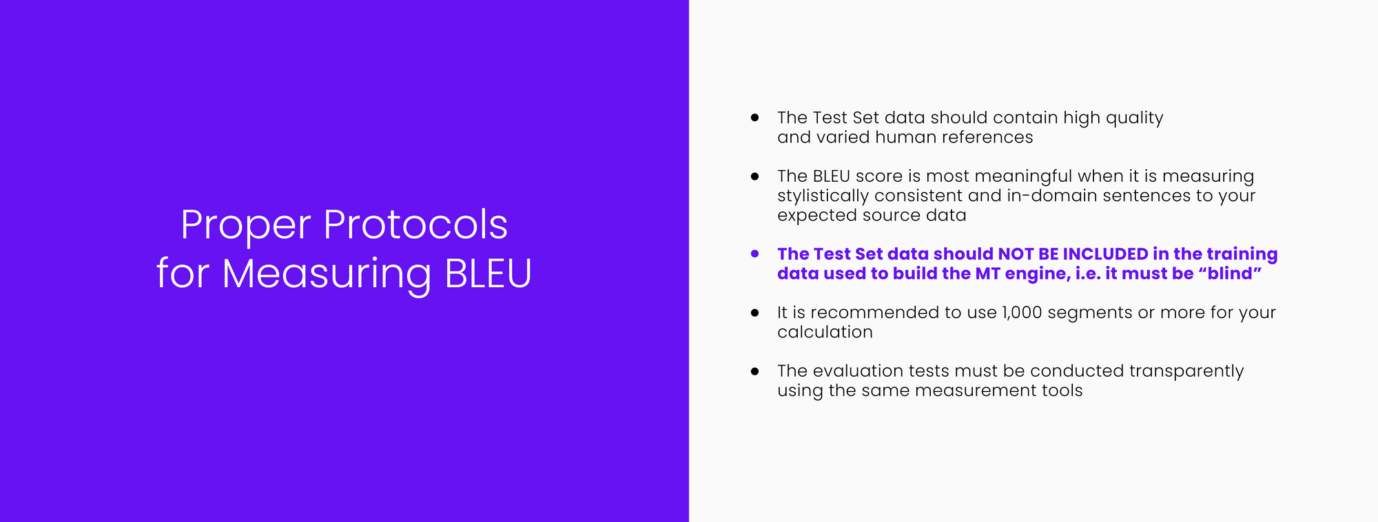 - One or more human reference translations. (This should be data that has NOT been used in building the system (training data) and ideally should be unknown to the MT system developer. It is generally recommended that 1,000+ sentences be used to get a meaningful measurement.) If you use too small a sample set you can sway the score significantly with just a few sentences that match or do not match well.