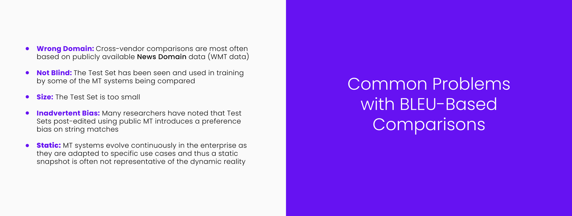 If a system is trained with the sentences in the “test set” it will obviously do well on the test but probably not as well on data that it has not seen before. Many recent comparisons score MT systems on news-domain (the most easily available data). A good score on news-domain may not be especially meaningful for an enterprise use case that is heavily focused on IT, pharma, travel, or any domain other than news.