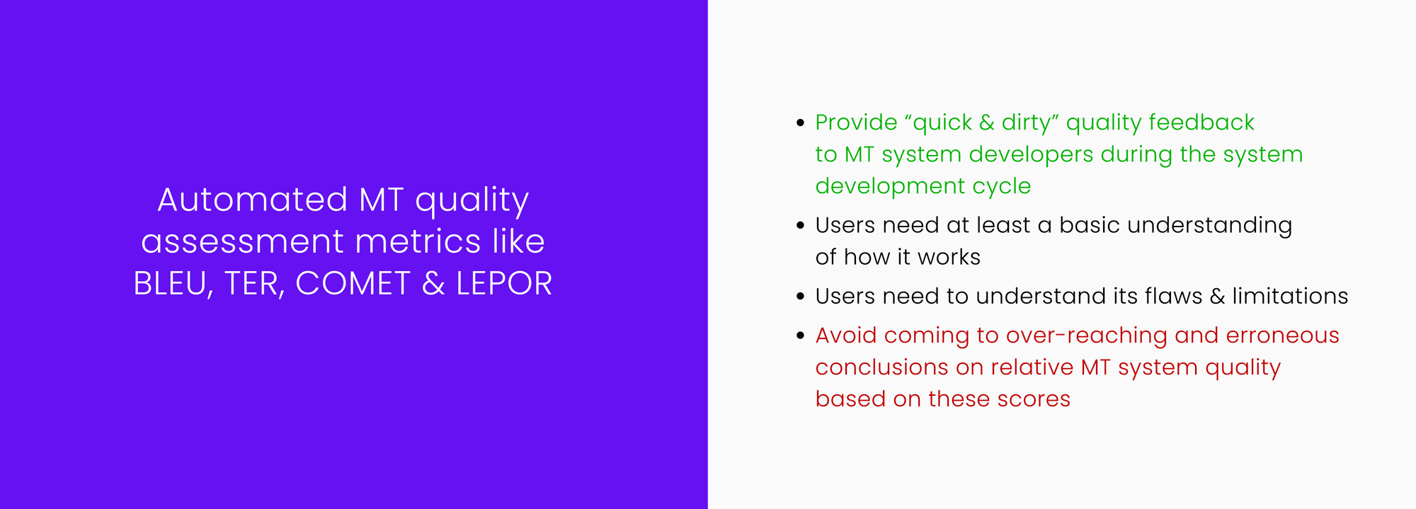 Thus, automated metrics like BLEU provide a quick and often dirty quality assessment that can be useful to those who actually understand its basic mechanics. However, they should also understand its basic flaws and limitations and thus avoid coming to over-reaching or erroneous conclusions based on these scores.