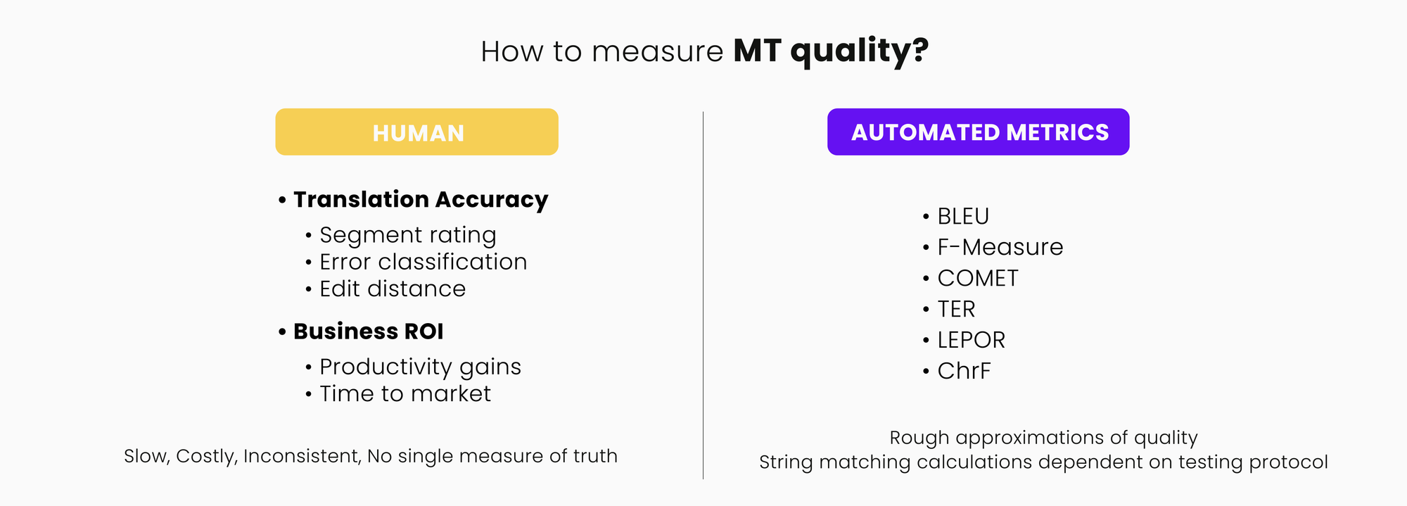 An overview of the techniques that exist today for measuring MT quality, while also dispelling common myths and misconceptions.